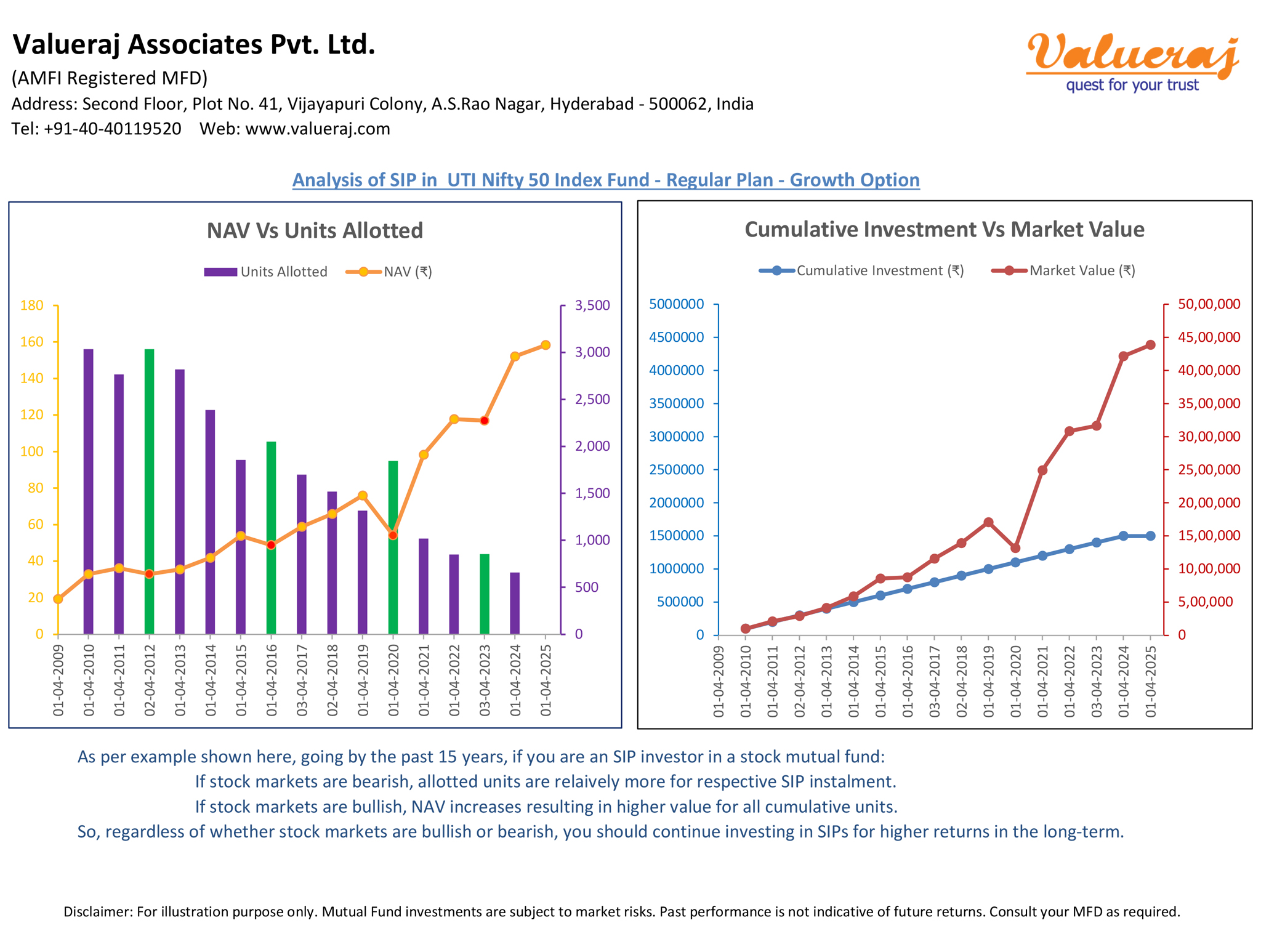 When it comes to investing in stock mutual funds, SIP (Systematic Investment Plan) method has inherent benefits. If stock markets are bearish, more units get allotted per SIP installment. If stock markets are bullish, NAV increases and so does the market value of all accumulated units. Thus, in the long-term, occasional bear markets help in reducing the average cost of investment and increasing the returns on investment.
