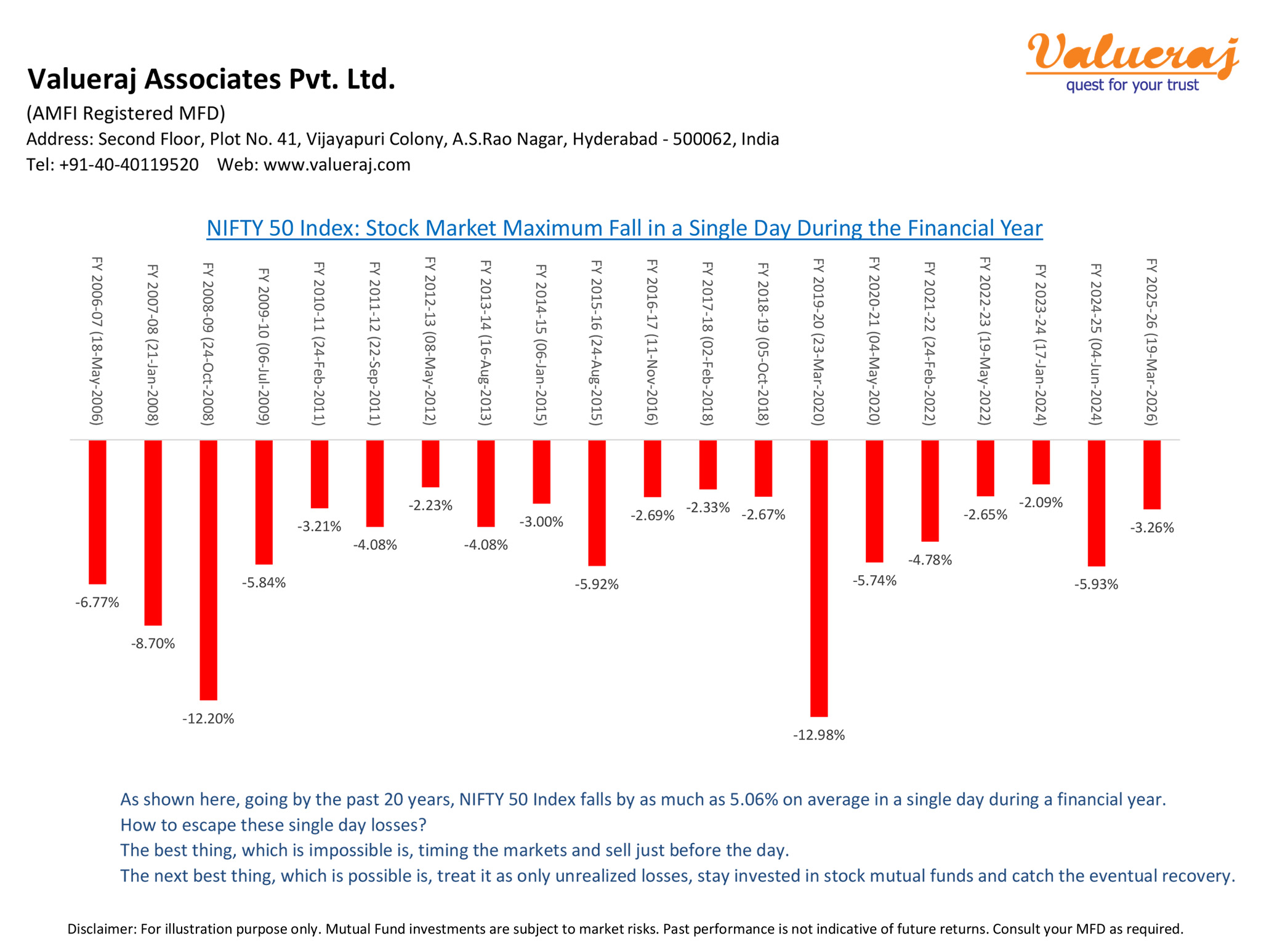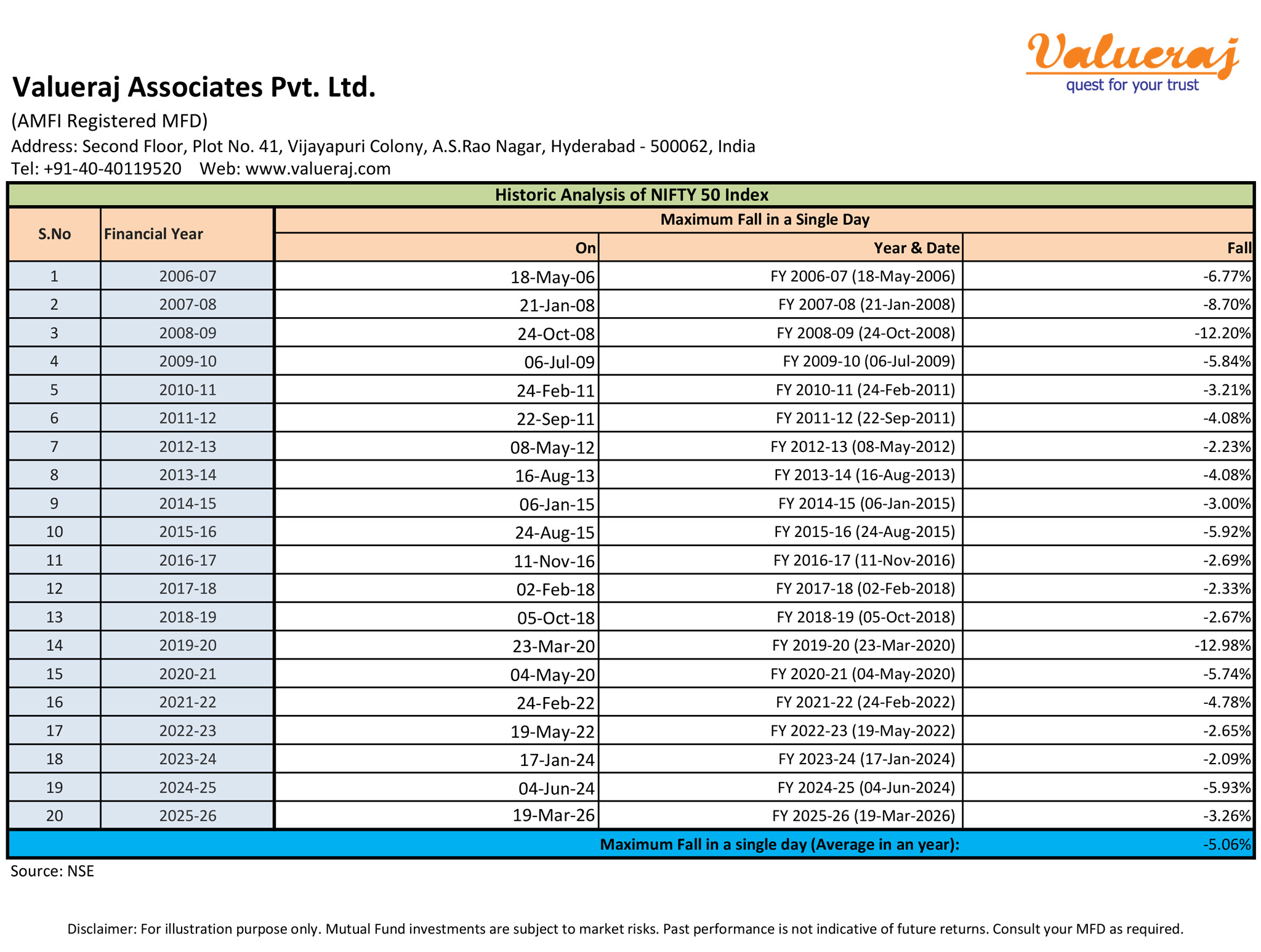 Find below the sudden single day falls of Nifty50 index in each financial year in the past 20 years.