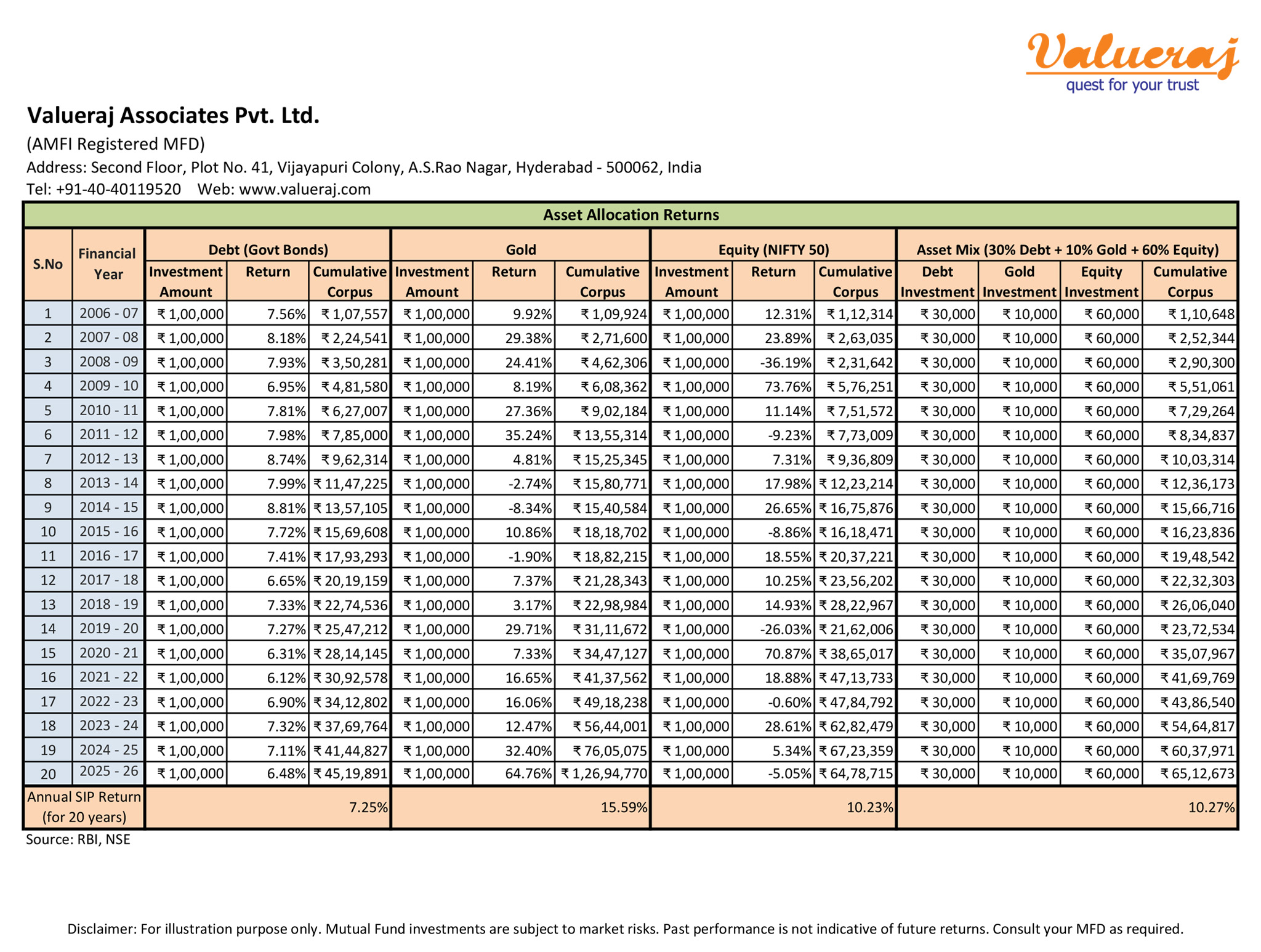 For example, find below our analysis on historic retuns of SIP investments in individual asset classes vis-à-vis a portfolio with asset allocation of Debt:Gold:Equity in 30:10:60 mix.