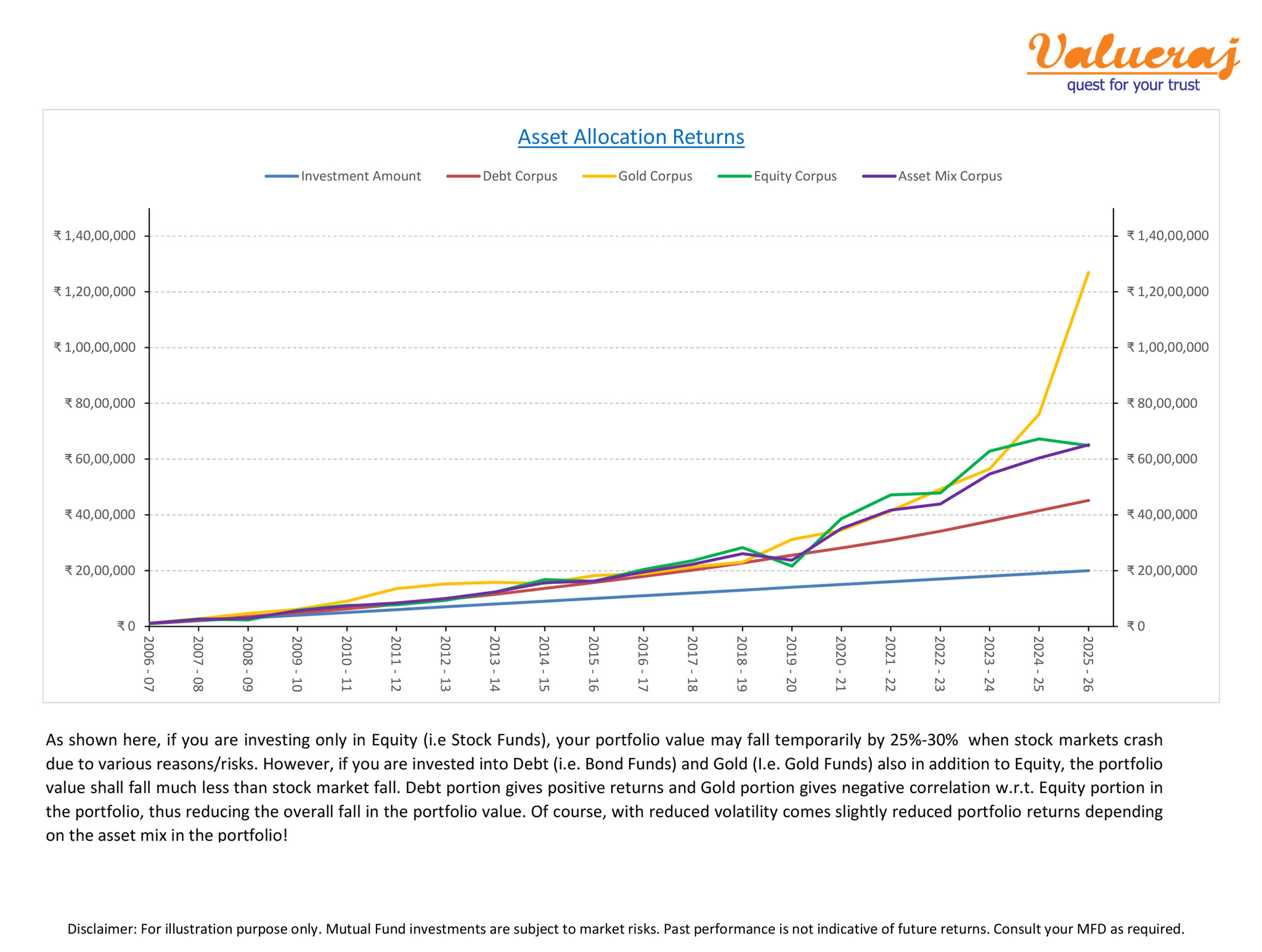 In essence, if you are investing only in Equity, your portfolio value may fall temporarily by 25%-30% when stock markets crash due to various reasons/risks. However, if you are invested into Debt and Gold also in addition to Equity, the portfolio value shall fall much less than stock market fall. Debt portion gives positive returns and Gold portion gives negative correlation w.r.t. Equity portion in the portfolio, thus reducing the overall fall in the portfolio value.