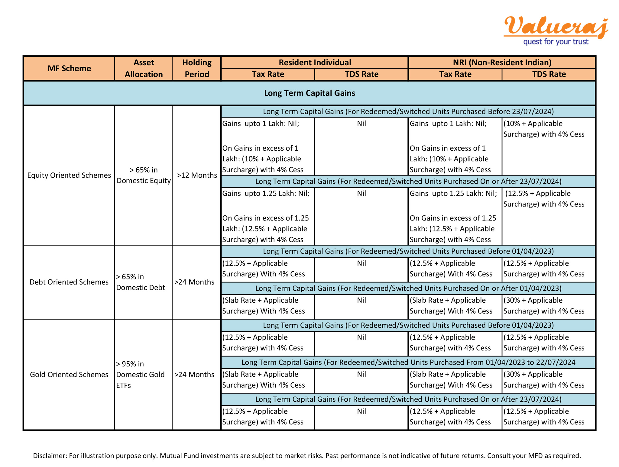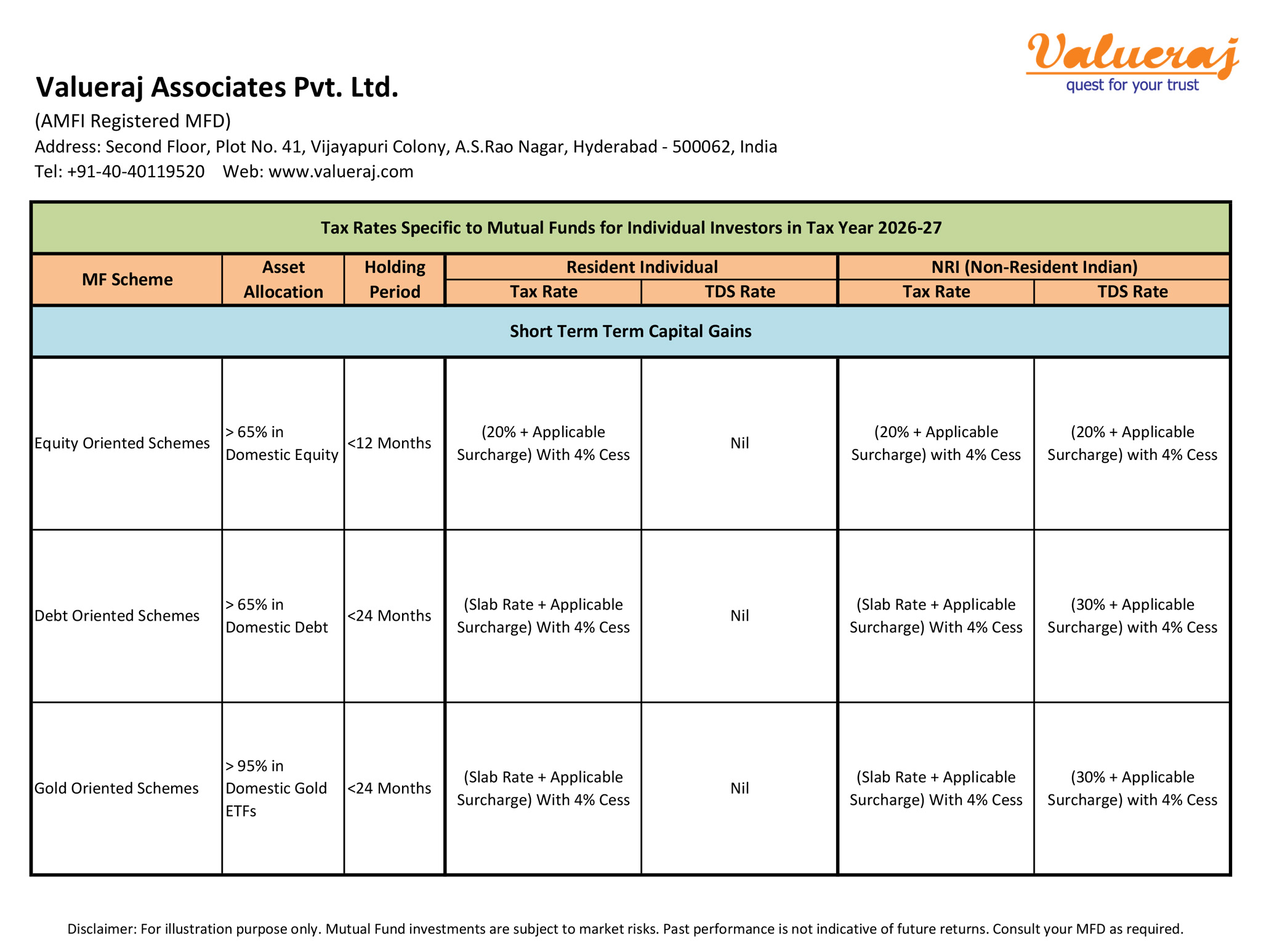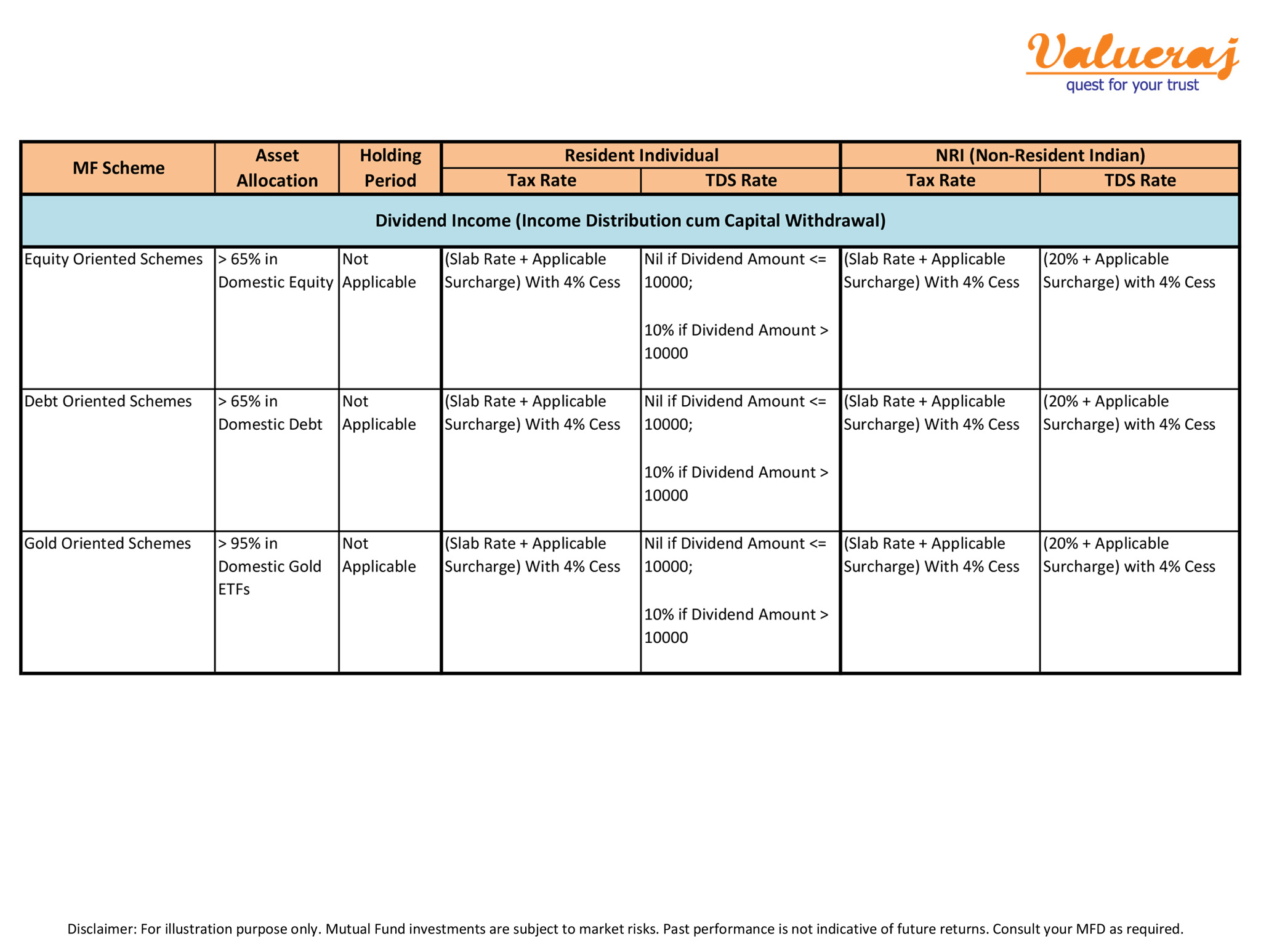 For your reference, find below the Tax Rates and TDS Rates specific to mutual funds for individual investors.