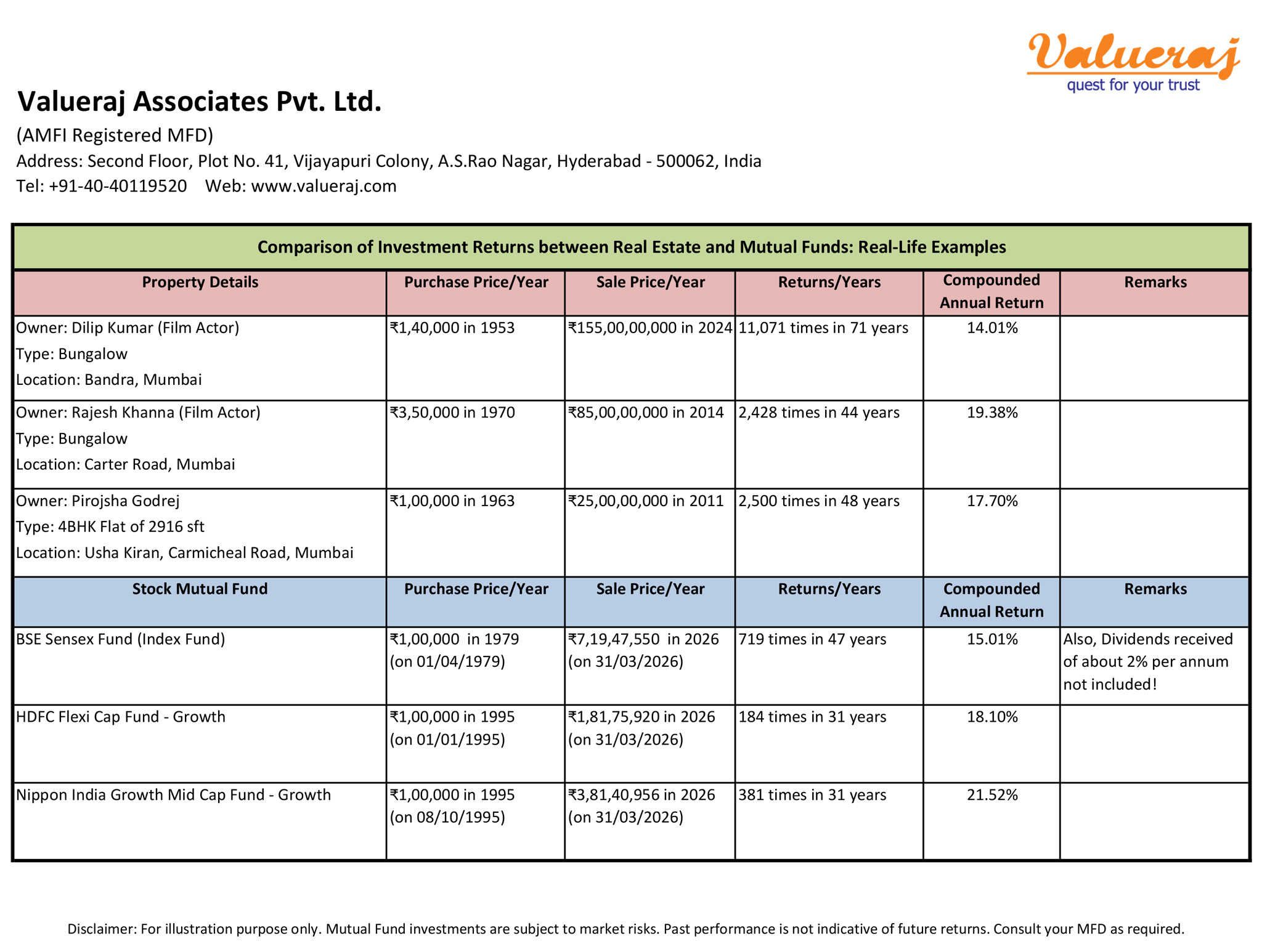 Find below some interesting real-life examples on returns of premier properties and select equity mutual funds.