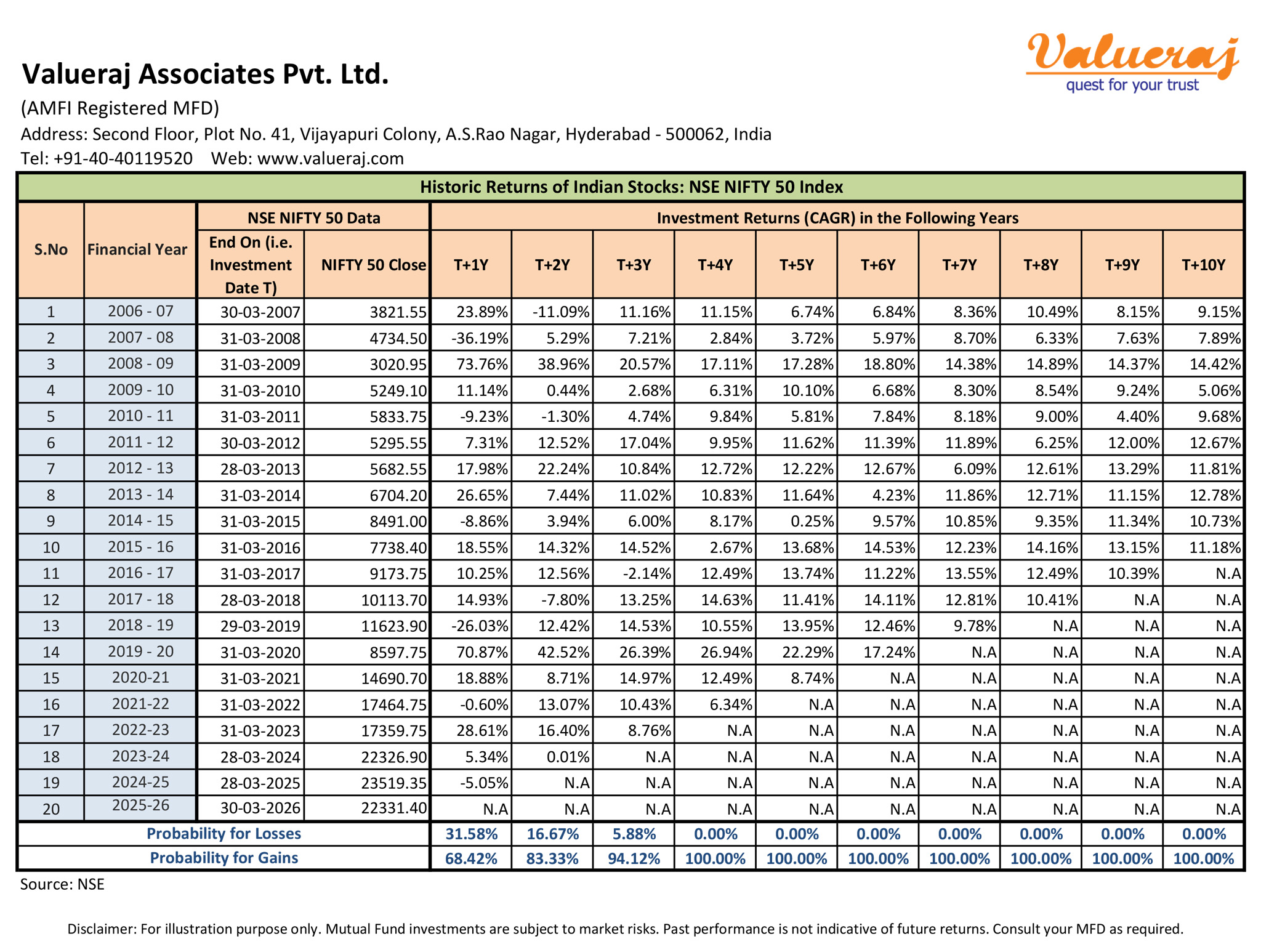Find below our analysis on historic probabilities of NIFTY50 Index making losses/gains in subsequent years in the past 20 years.