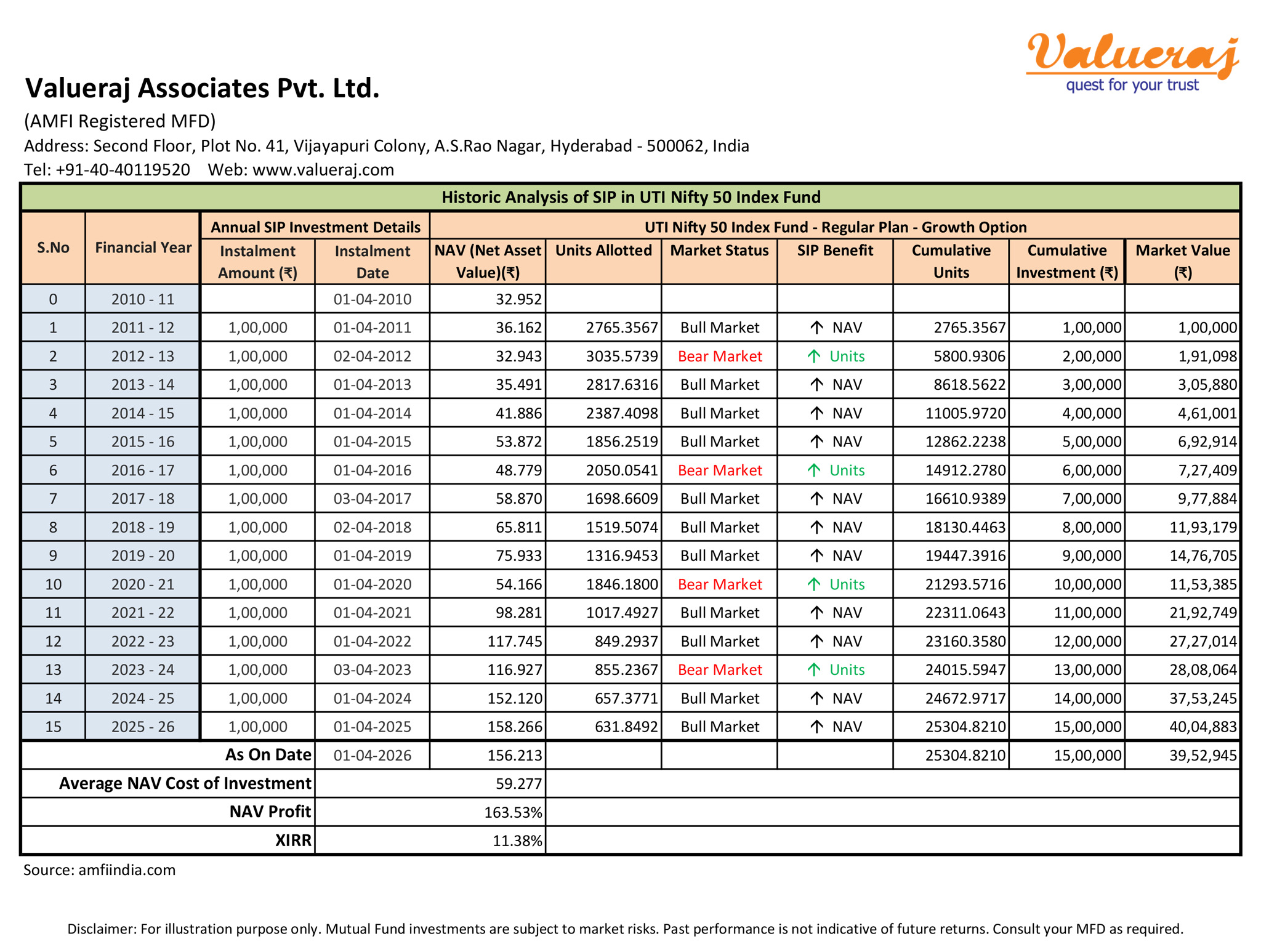 For illustration, find below our analysis on benefits of annual SIP over last 15 years in an index fund i.e. ‘UTI Nifty 50 Index Fund – Regular Plan – Growth Option’.