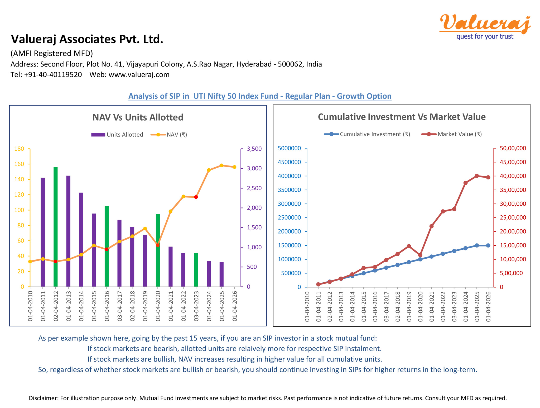When it comes to investing in stock mutual funds, SIP (Systematic Investment Plan) method has inherent benefits. If stock markets are bearish, more units get allotted per SIP installment. If stock markets are bullish, NAV increases and so does the market value of all accumulated units. Thus, in the long-term, occasional bear markets help in reducing the average cost of investment and increasing the returns on investment.