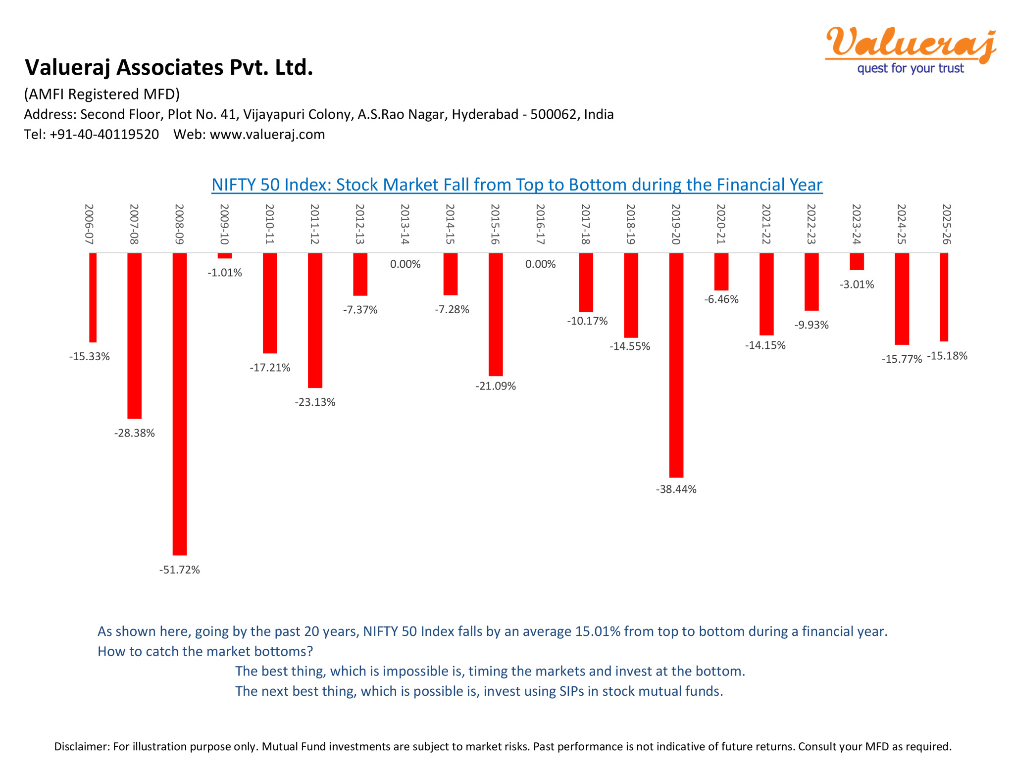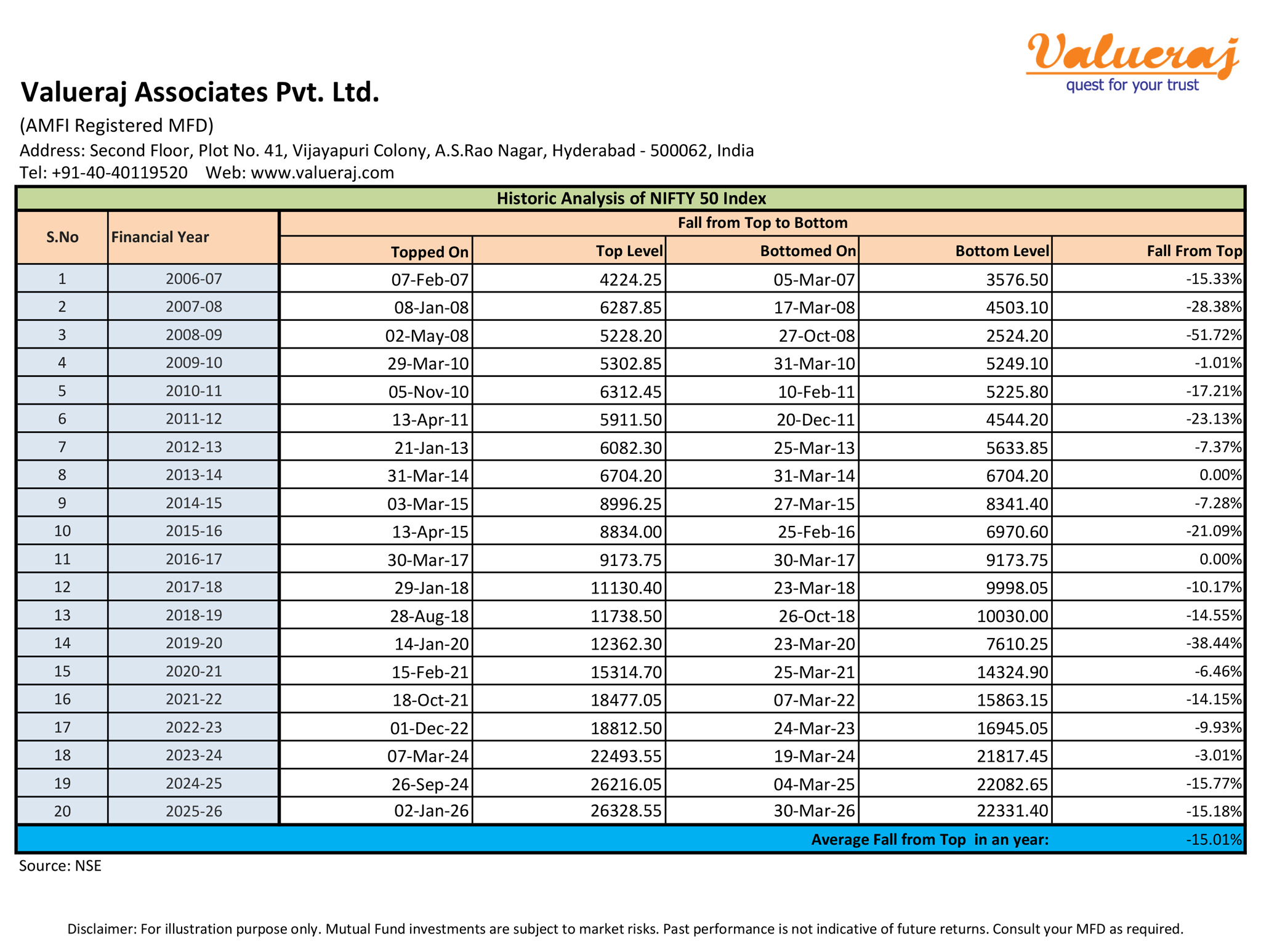 Find below the Nifty50 index fall from peak in each financial year in the past 20 years.