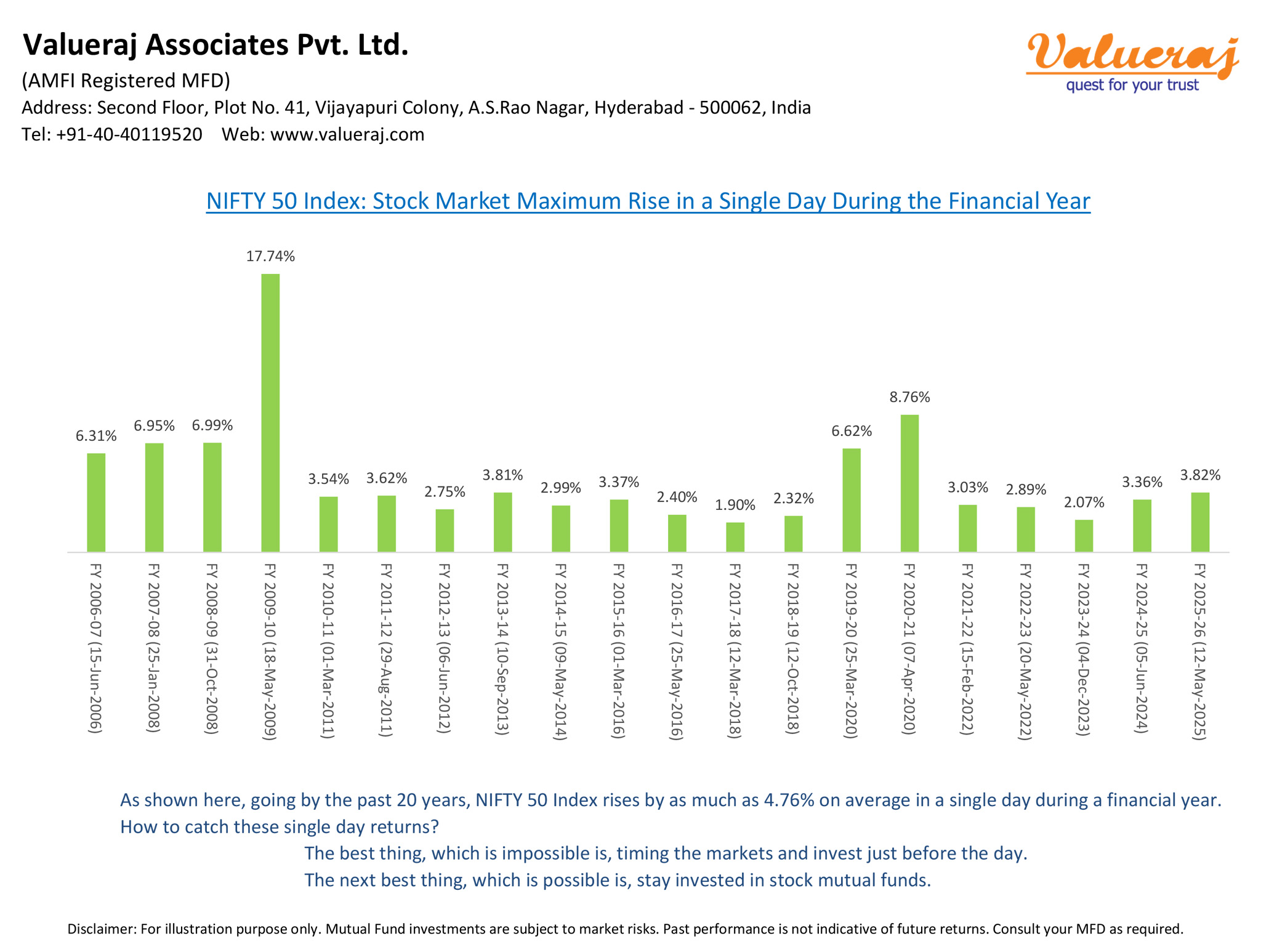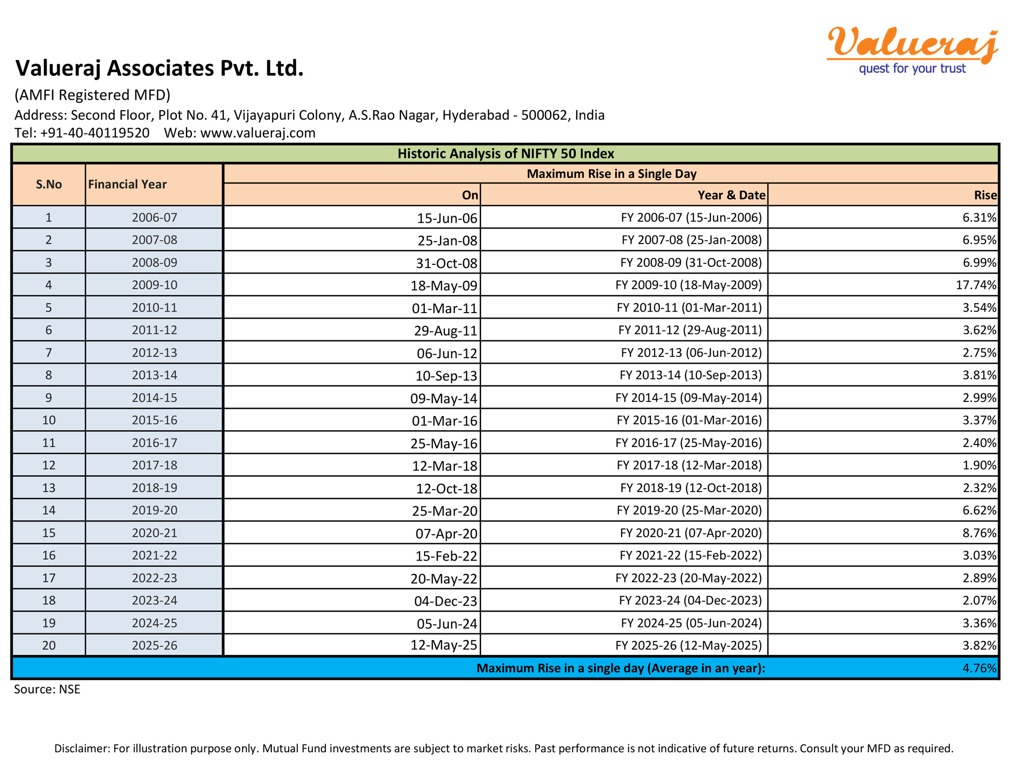 Find below the maximum rise of Nifty50 index in a single day, in each financial year in the past 20 years.